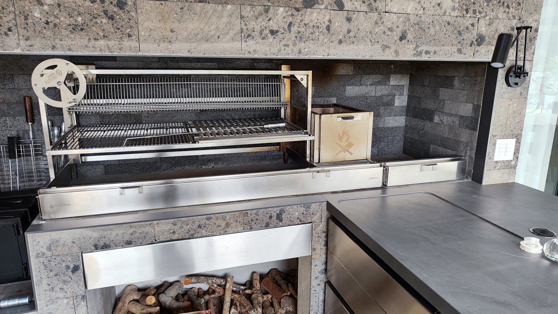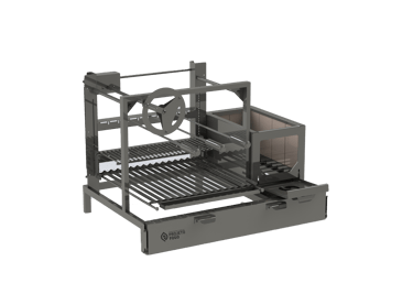 Sistema de parrilla com QUADRO de apoio, facilitando a instalação. Composto por conjunto de parrillas, principal e descanso de legumes, com ELEVAÇÃO POR VOLTANTE. Além de suporte em balanço com 2 galerias para espetos tradicionais MANUAIS. E o FIREBOX Completo, com refratários internos, revestimento externo em INOX e porta DUPLA Térmica. Sistema completo de parrilla com queima controlada de lenha.