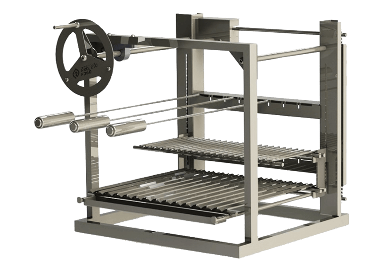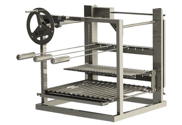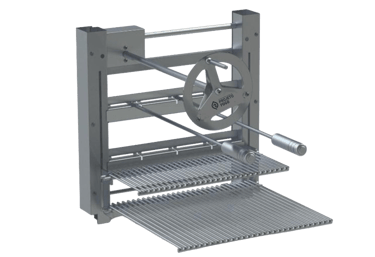 Sistema de parrilla com QUADRO de apoio, facilitando a instalação. Composto por conjunto de parrillas, principal e descanso de legumes, com ELEVAÇÃO POR VOLTANTE. Além de suporte em balanço com 2 galerias para espetos tradicionais MANUAIS. Excelente opção para pequenas churrasqueiras e espaços, e assadores que priorizam o uso do carvão como combustível.