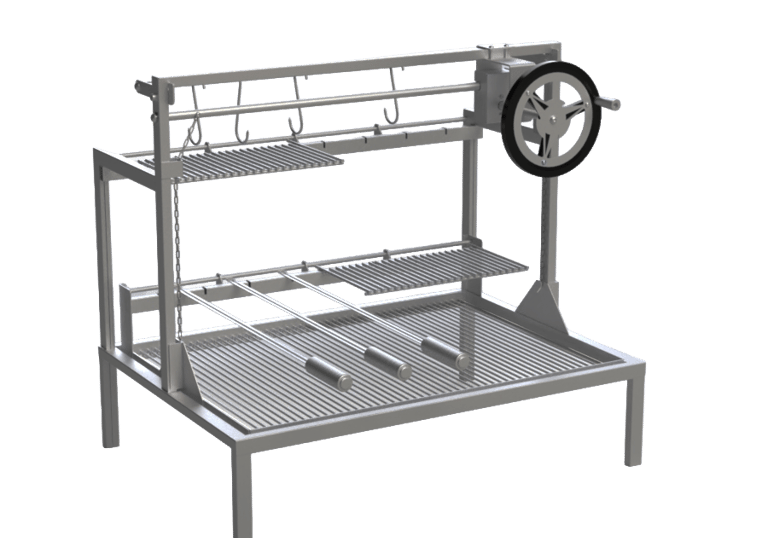 Sistema de parrilla completo com parrilla/grelha principal com ELEVAÇÃO POR VOLANTE, sistema de corrente. Além de suporte em balanço com 2 galerias para espetos tradicionais MANUAIS e grelhas tipo DESCANSO DE LEGUMES. Consta ainda com pés embutidos e VARAL com GANCHOS para pendurar cortes e o que quiser preparar em sua parrilla. Ótima opção, completo, para sua parrilla, casando bem com um lenheiro auxiliar e para usar com carvão e/ou lenha.