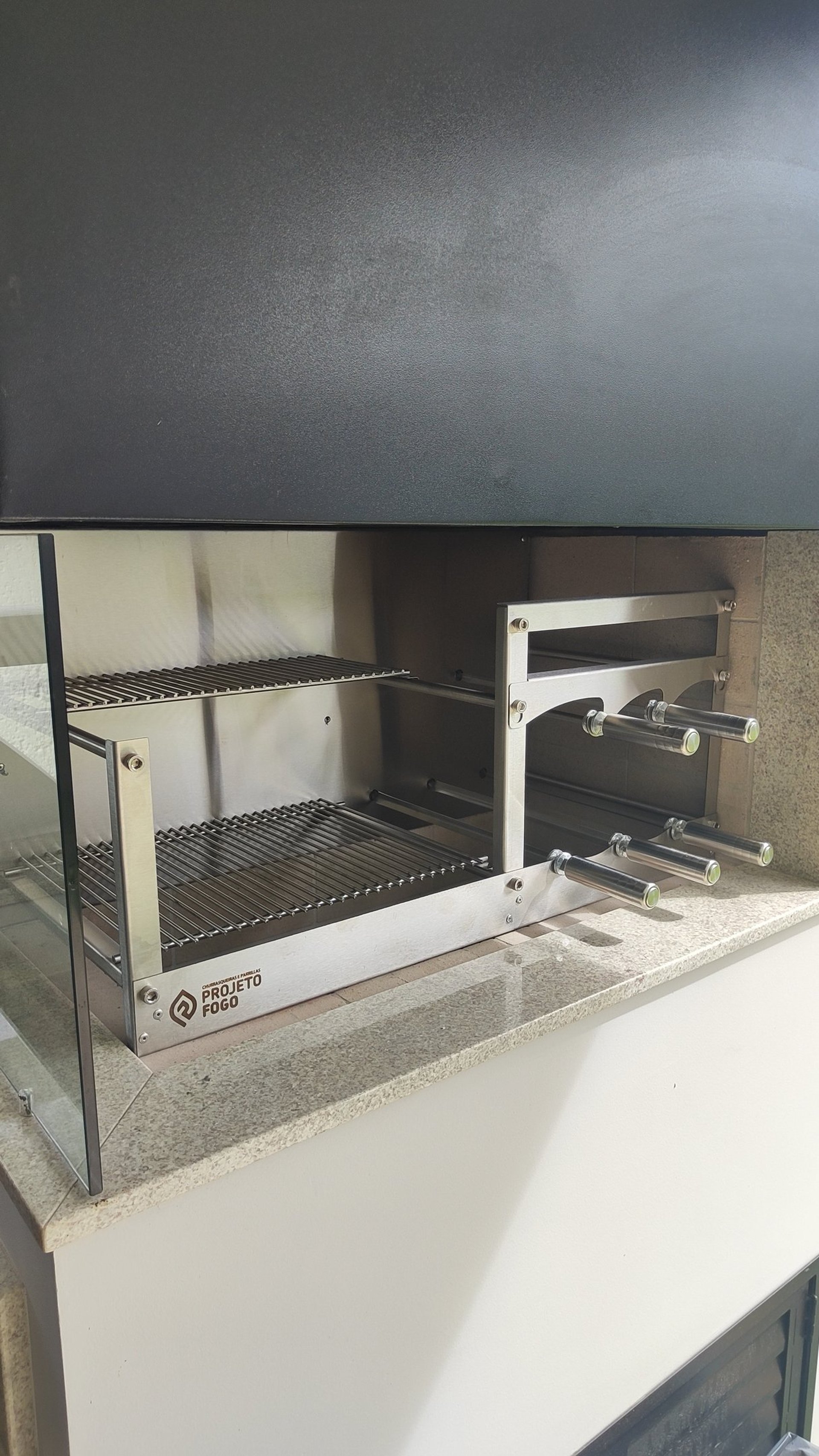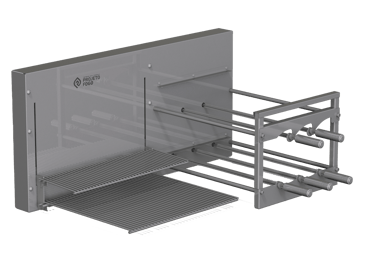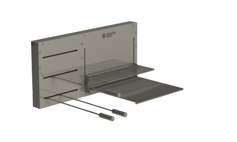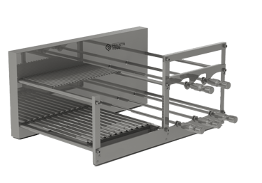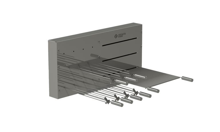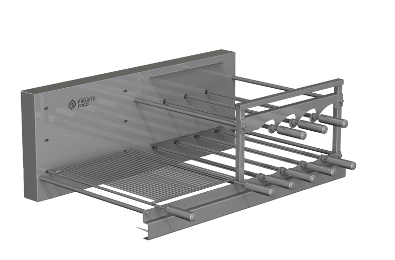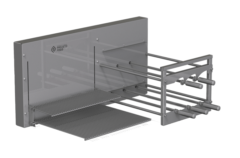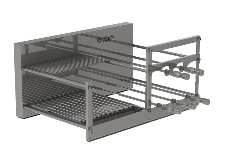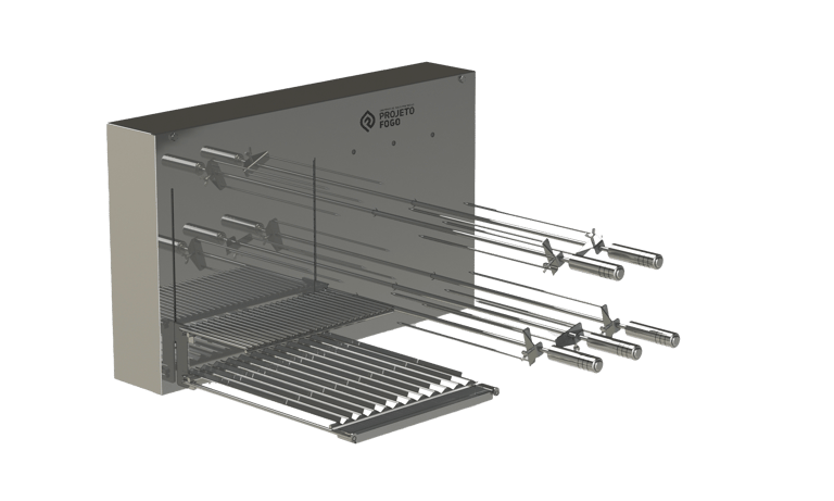 Sistema DUPLO misto com grelha ou parrilla AUTOMÁTICA num lado e sistema rotativo FLUTUANTES de espetos. Conta com grelha de descanso. É o top de linha da Projeto Fogo, sistema automática de grelhas com rotativo flutuante, projeto limpo, sem suportes frontais, deixado o visual da sua churrasqueira clean e de fácil limpeza. Disponíveis alguns acessórios para os espetos.