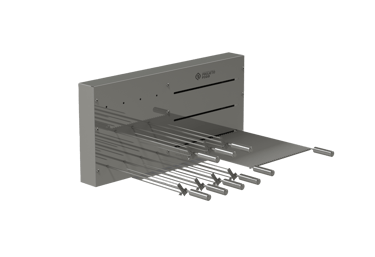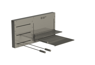 Sistema DUPLO misto com grelha ou parrilla AUTOMÁTICA num lado e sistema de suporte pêndulo para espetos MANUAIS. Conta com grelha descanso de legumes. Equipamento com bom custo benefício e flexibilidade na sua utilização. Além de ser um projeto limpo, sem suportes frontais, deixado o visual da sua churrasqueira clean e de fácil limpeza. Disponíveis alguns acessórios para os espetos.