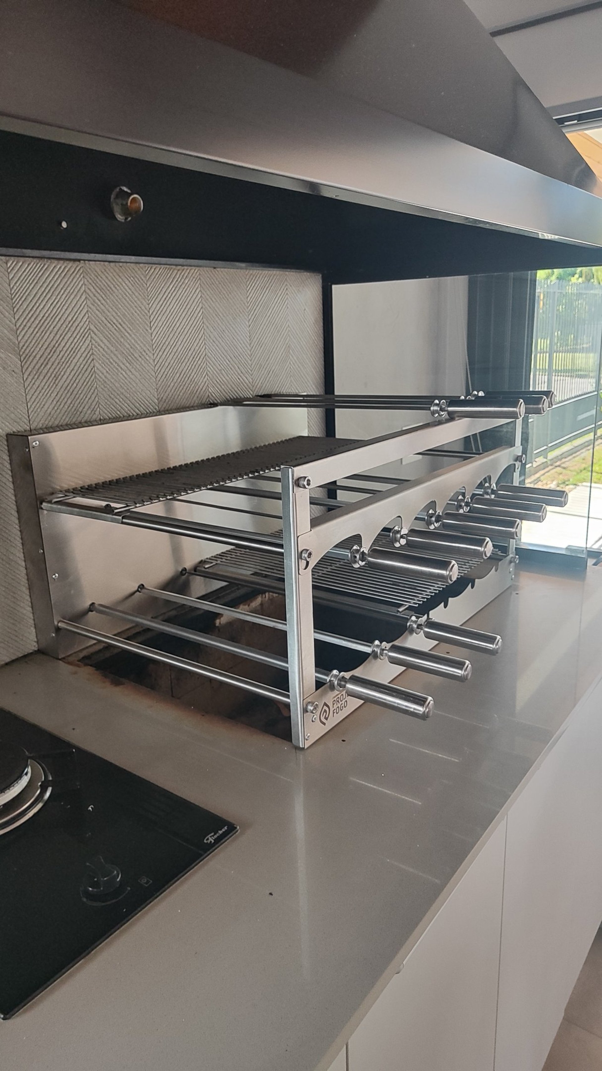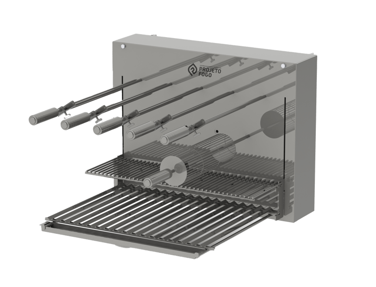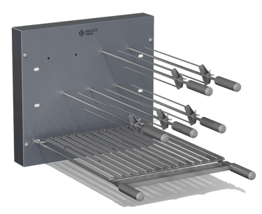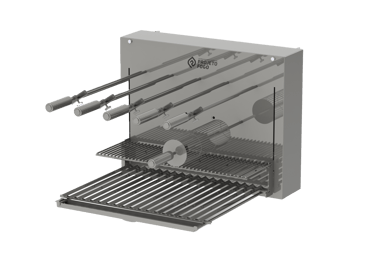Sistema DUPLO em um único equipamento, com espetos rotativos tradicionais, com apoio frontal em 2 galerias de espetos, descanso superior para espetos e sistema de elevação para Grelha ou Parrilla do tipo AUTOMATIZADA. É um sistema completo para pequenas e grandes churrasqueiras. Utilização combinada de espetos e grelhas ao mesmo tempo. Disponíveis alguns acessórios para complementar o equipamento.