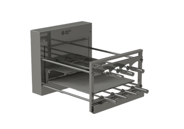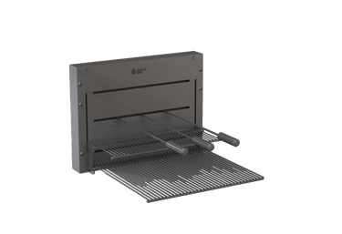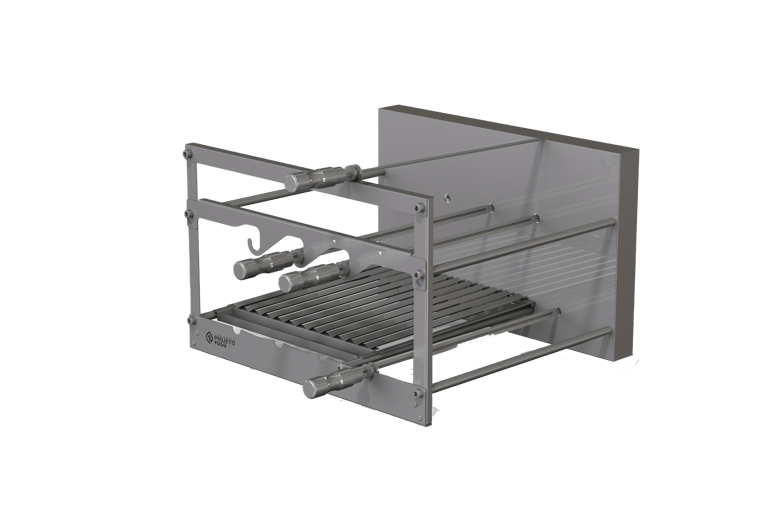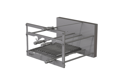 Sistema DUPLO misto com grelha ou parrilla principal em BALANÇO e MANUAL, usável em 3 galerias de altura, juntamente com sistema rotativo de espetos básicos com apoio frontal. Opção ideal para assadores que usam tanto os espetos, quanto a grelha. Possui ótima relação custo benefício, dimensões ajustáveis para adaptar-se a churrasqueiras preexistentes. Disponíveis alguns acessórios para os espetos.