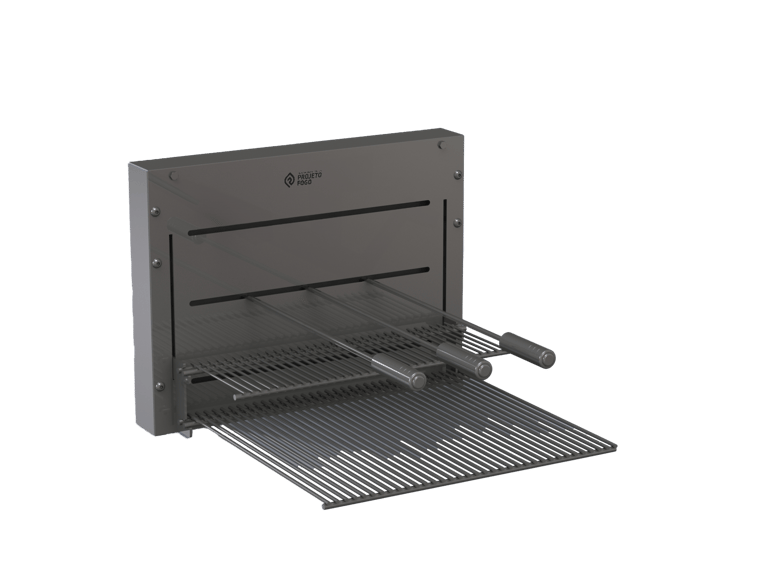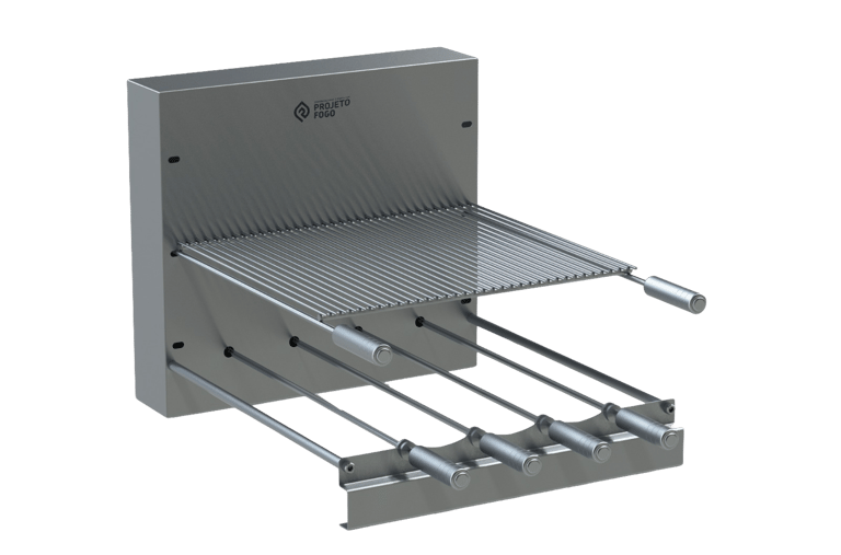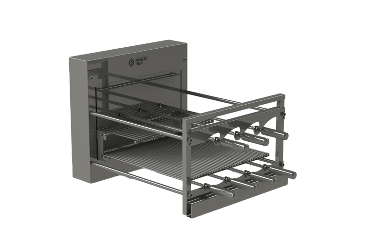 Sistema DUPLO misto com grelha ou parrilla principal SEMPRE de 40 cm, embutida na 1º galeria, e sistema rotativo de espetos tradicional com apoio frontal, com opção de adicionar um descanso superior para espetos e grelha descanso apoiada. Possui ótima relação custo benefício, dimensões ajustáveis para adaptar-se a churrasqueiras pré existentes. Dispoíveis alguns acessórios para os espetos.