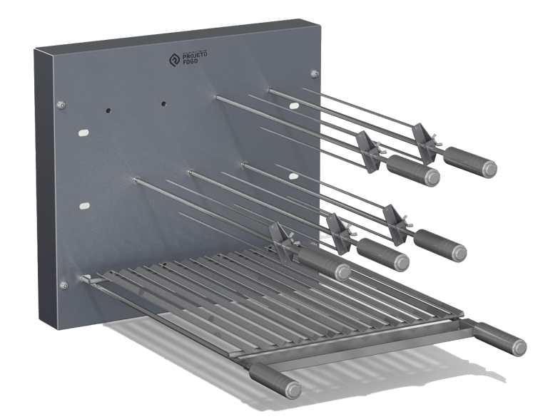 Sistema com espetos tipo FLUTUANTES (sem apoio frontal) mas SEM MOTORES e com sistema de elevação para Grelha ou Parrilla do tipo AUTOMATIZADA. É um sistema completo para pequenas e grandes churrasqueiras. Utilização combinada de espetos e grelhas ao mesmo tempo. Disponíveis alguns acessórios para complementar o equipamento.