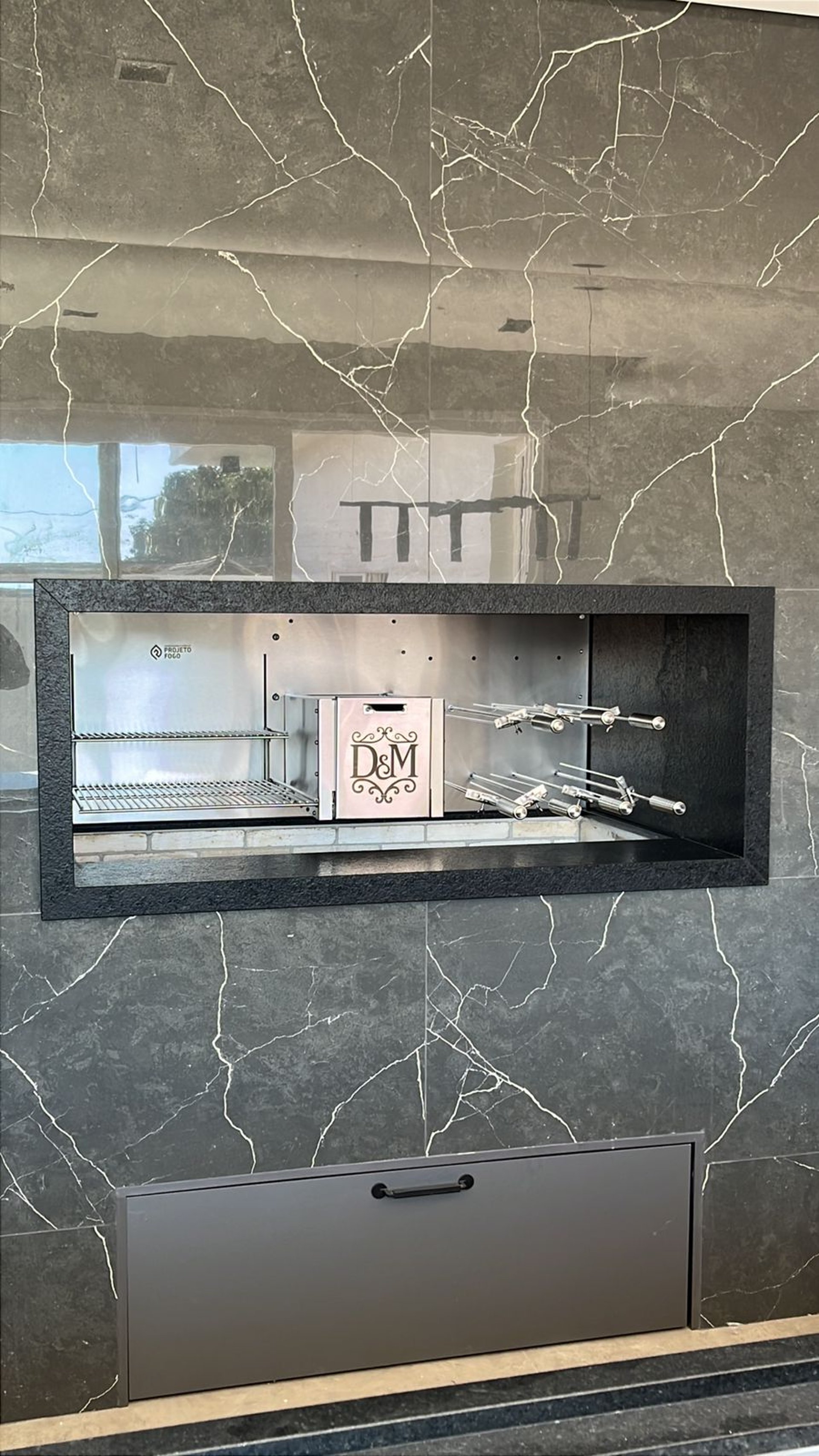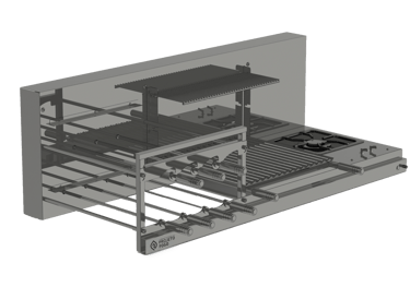 Sistema TRIPLO combinado com espetos ROTATIVOS (ou MANUAIS), juntamente com grelhas ou parrillas AUTOMÁTICAS (motorizadas) ou MANUAIS e anexo ao equipamento uma BIFETEIRA embutida, com boca industrial. Combinação com diversas variações e medidas possíveis. Ideal para espaços maiores e perfis de assadores que gostam de unir o preparo do seu churrasco, com pratos tradicionais realizados na bifeteira.