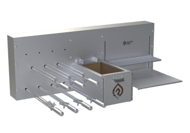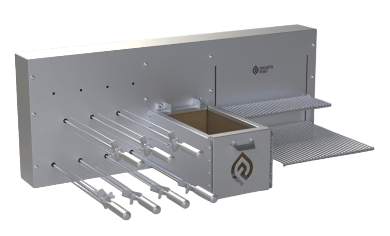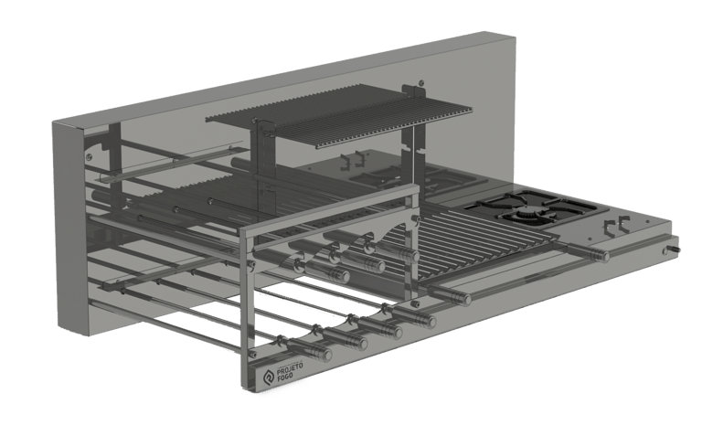 Sistema TRIPLO combinado com espetos ROTATIVOS (ou MANUAIS), juntamente com grelhas ou parrillas AUTOMÁTICAS (motorizadas) ou MANUAIS e anexo ao equipamento um FIREBOX completo, para utilização de lenha. Combinação com diversas variações e medidas possíveis. Ideal para espaços maiores e perfis de assadores que gostam de variar no seu churrasco e ter mais praticidade.